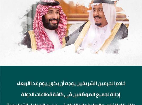 خــادم الحرمين الشريفين يوجه أن يكون يوم غد الاربعاء إجازة لجميع الموظفين