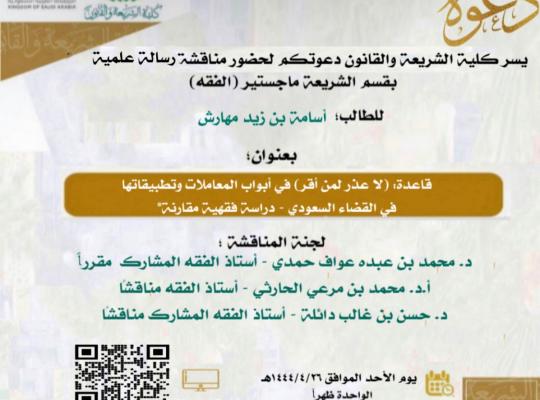 يسر كلية الشريعة والقانون دعوتكم لحضور مناقشة رسالة علمية بقسم الشريعة ماجستير ( الفقه )