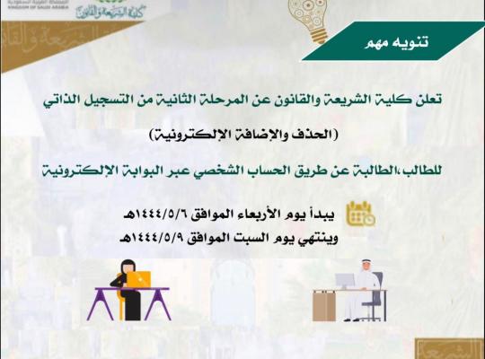 تعلن كلية الشريعة والقانون عن المرحله الثانيه من التسجيل الذاتي