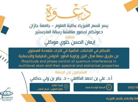مناقشة رسالة الماجستير للطالبة إيمان الحسن خلوي موكلي بعنوان "Amplitude and phase control of quantum interference in multilevel atom and their spectral and statistical properties" المشرفون علي الرسالة ا.د علي بن احمد الكاملي - د. جابر بن ولي حكمي