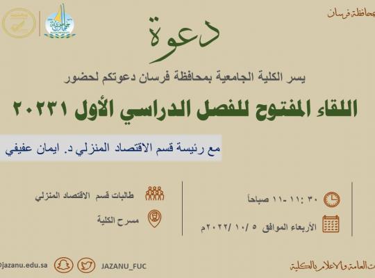 يسر الكليةالجامعيةبفرسان دعوتكم لحضور " اللقاء المفتوح للفصل الدراسي الأول ٢٠٢٣١ " مع رئيسة قسم الاقتصاد المنزلي د. ايمان عفيفي 🗓 الاربعاء ٢٠٢٢/١٠/٥م 🕘من الساعه ١١:٠٠ صباحاً الى ١١:٣٠ 📍مسرح الكلية الفئة المستهدفة: طالبات قسم الاقتصاد المنزلي