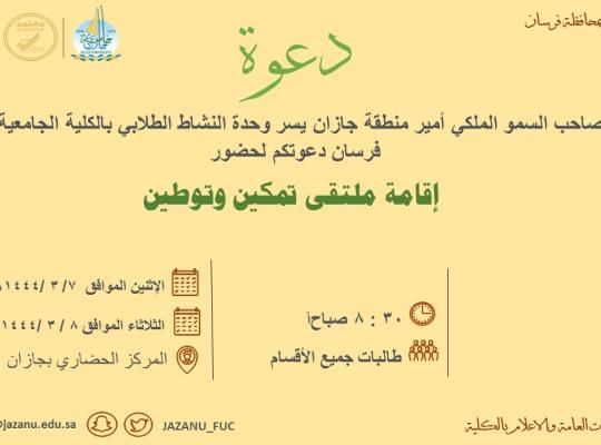 برعاية صاحب السمو الملكي أمير منطقة جازان يسر وحدة النشاط الطلابي بالكلية الجامعية بفرسان دعوتكم لحضور ملتقى تمكين للتوظيف يومي الاثنين 1444/03/7 والثلاثاء 1444/03/8 بالمركز الحضاري بجازان