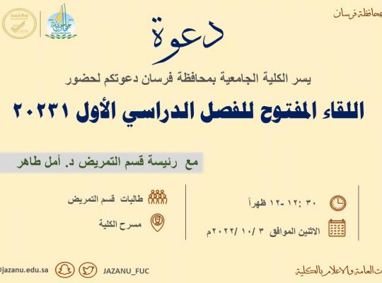 يسر الكليةالجامعيةبفرسان دعوتكم لحضور " اللقاء المفتوح للفصل الدراسي الأول ٢٠٢٣١ " مع رئيسة قسم التمريض د. أمل الطاهر 🗓 الأثنين ٢٠٢٢/١٠/٣م 🕘من الساعه ١٢:٠٠ ظهراً الى ١٢:٣٠ 📍مسرح الكلية الفئة المستهدفة: طالبات قسم التمريض