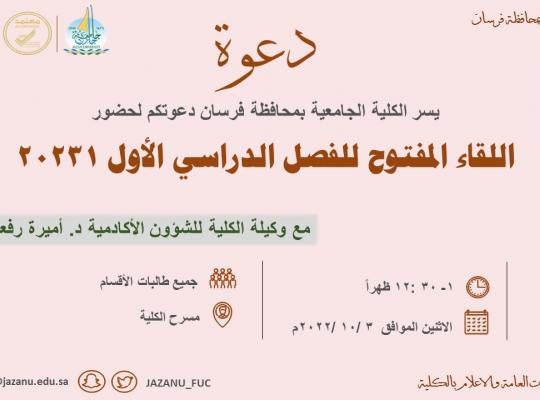 يسر الكليةالجامعيةبفرسان دعوتكم لحضور " اللقاء المفتوح للفصل الدراسي الأول ٢٠٢٣١ " مع سعادة عميدة الكلية د. عفاف بابعير 🗓 الأحد ٢٠٢٢/١٠/٢ 🕘من الساعه ٩:٣٠ ص الى ١١:٣٠ 📍قاعة التدريب بالكلية الفئة المستهدفة: طالبات الكلية بجميع الأقسام