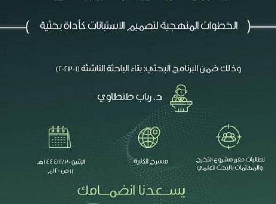 تتشرف الكلية التطبيقية بصامطة و الكلية الجامعية بصامطة سابقا بدعوتكم لحضور ورشة بعنوان "الخطوات المنهجية لتصميم الاستبانات كأداة بحثية" تندرج ضمن البرنامج البحثي "بناء الباحثة الناشئة"