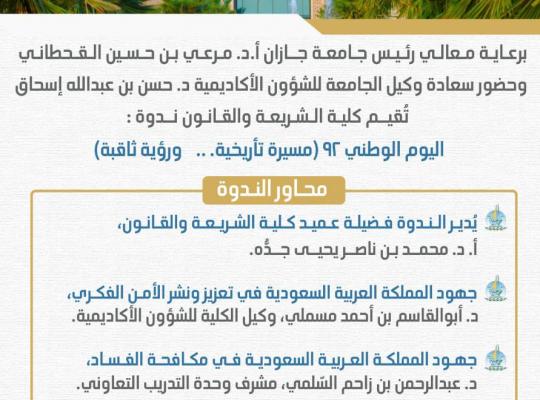 برعاية معالي رئيس جامعة جازان أ.د. مرعي بن حسين القحطاني وحضور سعادة وكيل الجامعة للشؤون الأكاديمية د. حسن بن عبدالله إسحاق تُقيم كلية الشريعة والقانون ندوة : اليوم الوطني 92 ( مسيرة تأريخية ... ورؤية ثاقبة )