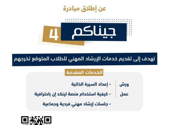 يعلن مركز علاقات الخريجين والتوظيف بعمادة شؤون الطلاب وبالتعاون مع #هدف عن إطلاق "مبادرة "جيناكم4" والتي تهدف إلى تقديم خدمات الإرشاد المهني لـ #طلبه_جامعه_جازان داخل كلياتهم، خلال الفترة من 2024/08/25 إلى 2024/10/15 للإطلاع على المواعيد يرجى مسح
