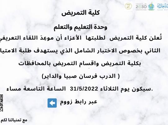 تعلن كلية التمريض لطلبتها الاعزاء بأن موعد اللقاء التعريفي الثاني بخصوص الاختبار الشامل الذي يستهدف طلبة الامتياز بكلية التمريض وأقسام التمريض بالمحافظات ( الدرب فرسان صبيا والداير) و سيكون يوم الثلاثاء 31 / 05 / 2022 م وذلك في تمام الساعة عبر رابط