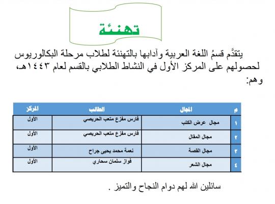 يتقدم قسم اللغة العربية وآدابها بالتهنئة لطلاب البكالوريوس لحصولهم على المركز الأول في النشاط الطلابي بالقسم لعام ١٤٤٣ه، سائلين الله لهم دوام التوفيق والنجاح والتميز.