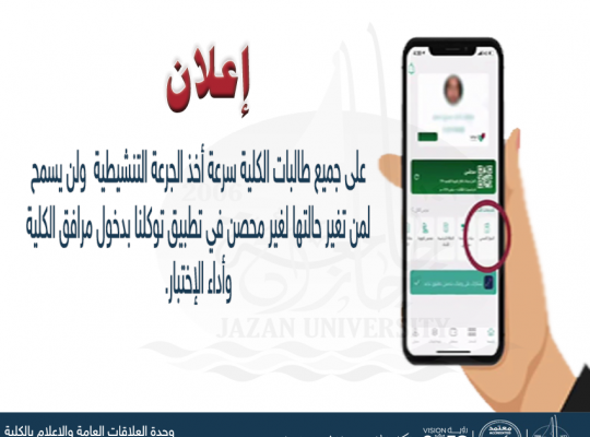 سارعي عزيزاتي الطالبة في أخذ الجرعة التنشيطية حيث لن يسمح لمن تغيرت حالتها في تطبيق توكلنا من محصن الي غير محصن من دخول مرافق الكلية وأداء الأختبار