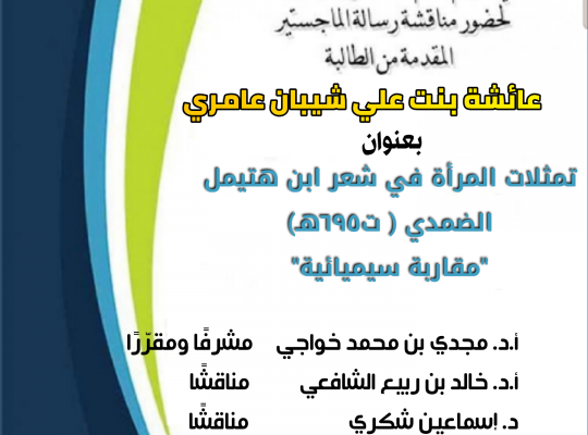 يدعوكم قسم اللغة العربية وآدابها بكلية الآداب والعلوم الإنسانية لحضور مناقشة علمية لرسالة الماجستير المقدمة من الطالبة/عائشة بنت علي شيبان عامري ، وعنوانها: (تمثلات المرأة في شعر ابن هتيمل الضمدي (ت٦٩٥هـ) "مقاربة سيميائية") وتتكون لجنة المناقشة