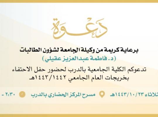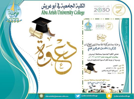 برعاية سعادة وكيلة الجامعة لشؤون الطالبات الدكتورة / فاطمة بنت عبدالعزيز عقيلي تحتفي الكلية الجامعية بمحافظة أبوعريش بطالباتها الخريجات لعام 1443هـ / 2022م ويسرها أن توجه لكم الدعوة لتشاركوها فرحتها اليوم: الخميس التاريخ: 25/ 10/ 1443هـ المقر: مسرح