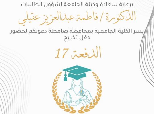 يسر الكلية الجامعية بصامطة دعوتكم لحضور حفل تخريج الدفعة 17 من طالباتها.