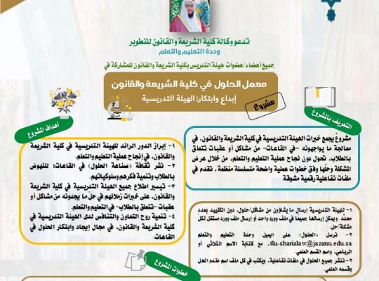 بتوجية ورعاية ومتابعة عميد كلية الشريعة والقانون أ.د. محمد بن ناصر يحيى جدٌه تدعوا وكالة كلية الشريعة والقانون للتطوير وحدة التعليم والتعلم جميع أعضاء / عضوات هيئة التتدريس بكلية الشريعة والقانون للمشاركة في معمل الحلول في كلية الشريعة والقانون إبداع