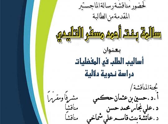 يدعوكم قسم اللغة العربية وآدابها بكلية الآداب والعلوم الإنسانية لحضور مناقشة علمية لرسالة الماجستير المقدمة من الطالبة/ سالمة بنت أحمد مسفر التليدي، وعنوانها: (أساليب الطلب في المفضليات "دراسة نحوية دلالية") وتتكون لجنة المناقشة والحكم على الرسالة من