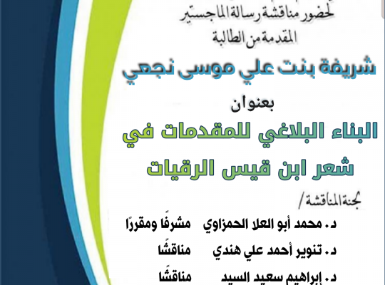 يدعوكم قسم اللغة العربية وآدابها بكلية الآداب والعلوم الإنسانية لحضور مناقشة علمية لرسالة الماجستير المقدمة من الطالبة/ شريفة بنت علي موسى نجعي، وعنوانها: (البناء البلاغي للمقدمات في شعر ابن قيس الرقيات) وتتكون لجنة المناقشة والحكم على الرسالة من