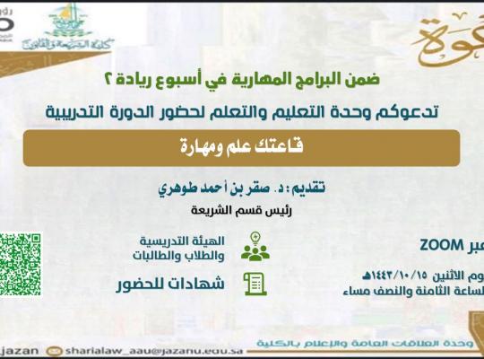 ضمن فعاليات ريادة٢ 🎙 دورة " قاعتك علم ومهارة " 👤يقدمها د. صقر بن أحمد طوهري (رئيس قسم الشريعة) 🗓 الاثنين ١٥ شوال ١٤٤٣هـ 🕰 الساعة ٨.٣٠ مساء https://zoom.us/j/91637501258?pwd=S0oxL0RTZDkxdWVURlN2aXEvd0xPdz09 📌 الهيئة التدريسية، والطلاب والطالبات 📜 توجد