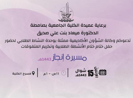 تتشرف الكلية الجامعية بمحافظة بصامطة بدعوتكم لحضور الحفل الختامي للأنشطة الطلابية "مسيرة_إنجاز ١٤٤٣هـ "