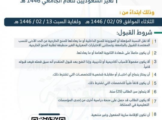 الجدول الزمني لقبول طلبة المنح الداخلية لغير السعوديين للعام 1446هـ.