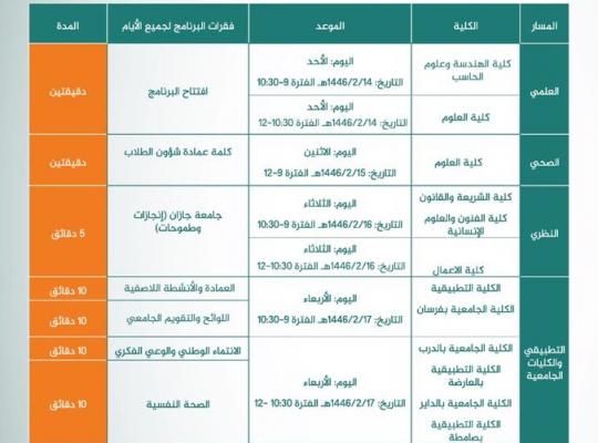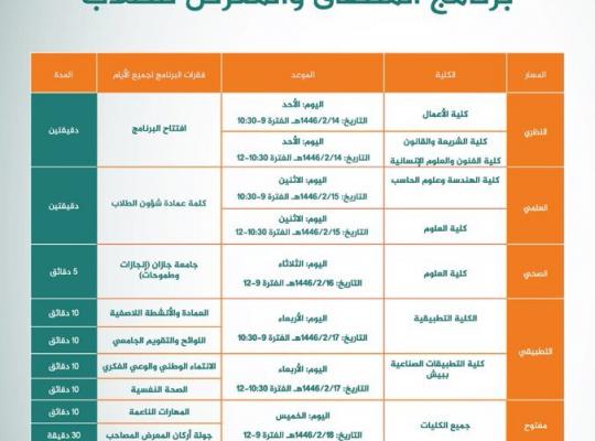 تفاصيل برنامج ملتقى ومعرض تهيئة الطلبة المستجدين للطلاب حسب المسار والكلية والذي ينطلق الأحد ولمدة أسبوع بمسرح كلية الأعمال بالحرم الجامعي.