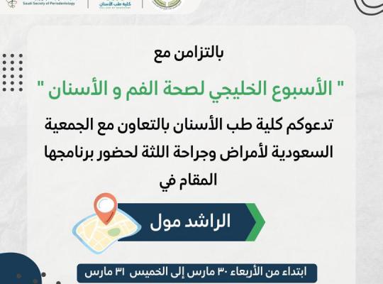 تدعوكم #كلية_طب_الأسنان بالتعاون مع الجمعية السعودية لأمراض وجراحة اللثة لحضور برنامجها التوعوي #صحتي_تبدأ_من_فمي المقام في كادي مول والراشد مول، وذلك بالتزامن مع #الأسبوع_الخليجي_الموحد_لتعزيز_صحة_الفم_والأسنان ..