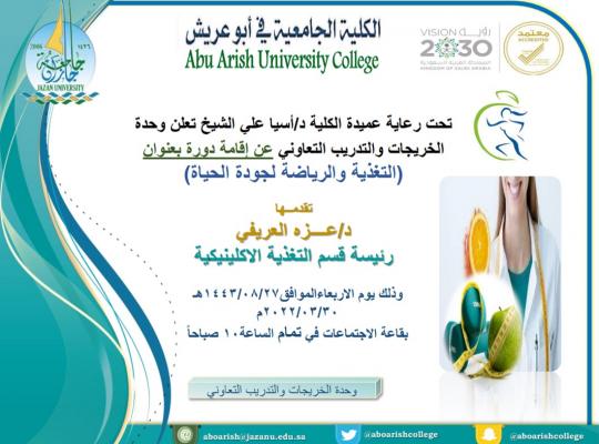 برعاية عميدة الكلية د. آسيا علي الشيخ تعلن وحدة الخريجات والتدريب التعاوني عن إقامة دورة بعنوان التغذية والرياضة لجودة الحياة تقدمها رئيسة قسم التغذية الإلكترونية د. عزة العريفي يوم الأربعاء الموافق 30-3-2022م