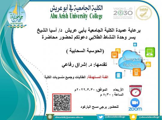 برعاية عميدة الكلية الجامعية بأبي عريش د. آسيا الشيخ يسر وحدة النشاط الطلابي دعوتكم لحضور محاضرة الحوسبة السحابية تقدمها إشراف رفاعي يوم الأربعاء الموافق 30-3-2022م