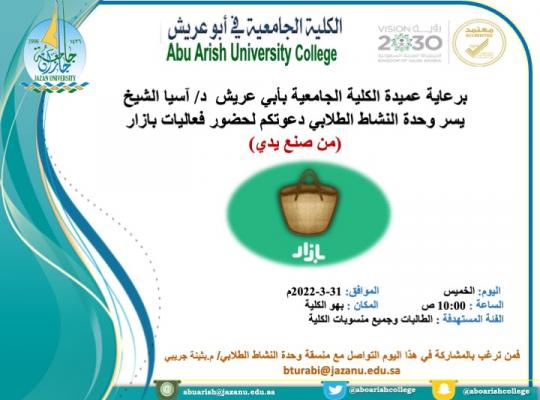 برعاية عميدة الكلية الجامعية بأبي عريش د. آسيا الشيخ يسر وحدة النشاط الطلابي دعوتكم لحضور فعالية بازار (من صنع يدي) يوم الخميس الموافق 31-3-2022م