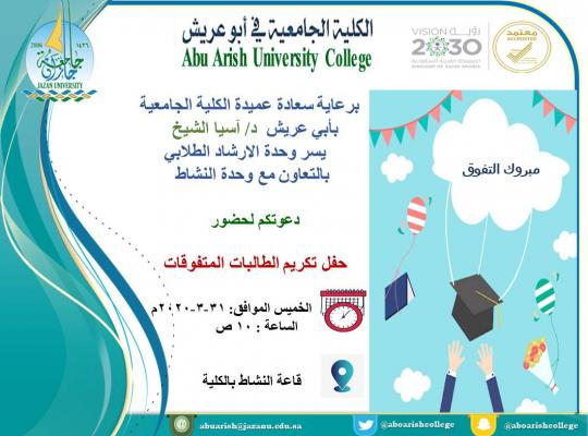 برعاية سعادة عميدة الكلية الجامعية بأبي عريش د. آسيا علي الشيخ يسر وحدة الإرشاد الطلابي بالتعاون مع وحدة النشاط الطلابي دعودتكم لحضور حفل تكريم الطالبات المتفوقات يوم الخميس الموافق 31-3-2022م