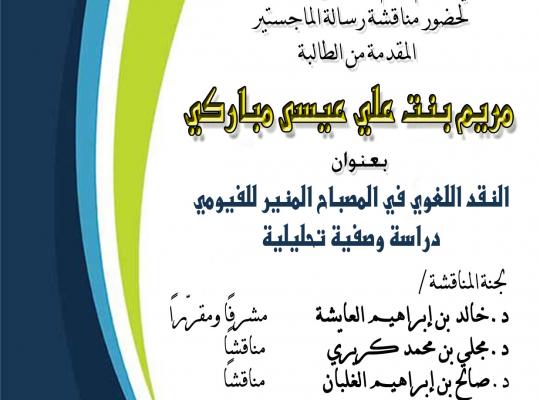 يدعوكم قسم اللغة العربية وآدابها بكلية الآداب والعلوم الإنسانية لحضور مناقشة علمية لرسالة الماجستير المقدمة من الطالبة/ مريم بنت علي عيسى مباركي، وعنوانها: (النقد اللغوي في المصباح المنير للفيومي "دراسة وصفية تحليلية") وتتكون لجنة المناقشة والحكم على