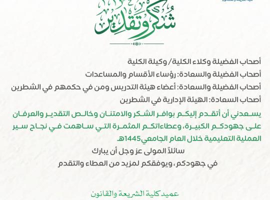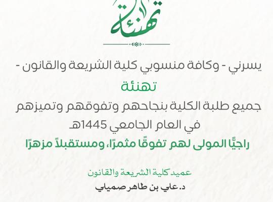 يسر عميد ومنسوبي كلية الشريعة والقانون تهنئة جميع طلبة الكلية بنجاحهم وتفوقهم وتميزهم في العام الجامعي ١٤٤٥هـ