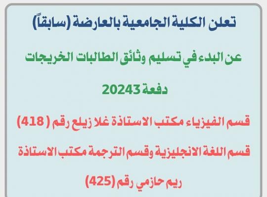 تعلن الكلية الجامعية بالعارضه (سابقاً) عن البدء في تسليم وثائق الطالبات الخريجات لقسم (اللغة الانجليزية - الفيزياء)دفعة 20243