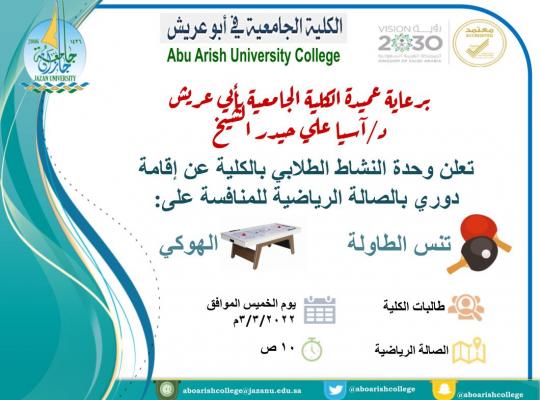 برعاية عميدة الكلية د. آسيا الشيخ تعلن الكلية الجامعية بأبي عريش ممثلة في وحدة النشاط الطلابي عن إقامة دوري بالصالة الرياضة للمنافسة علي تنس الطاولة والهوكي إشراف : م. بثينة جريبي يوم : الخميس التاريخ: 3-3-2022م