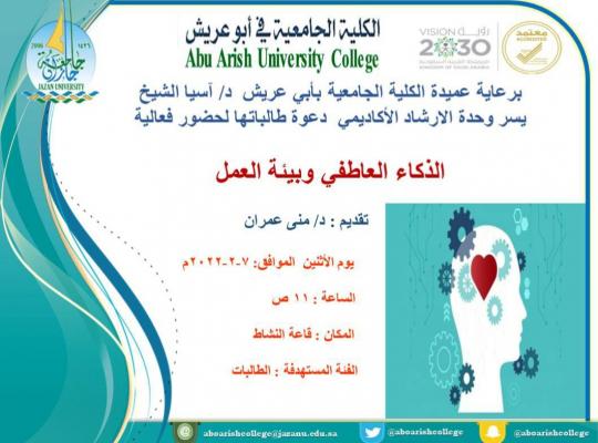 برعاية عميدة الكلية الجامعية بأبي عريش د. آسيا الشيخ يسر وحدة الإرشاد الأكاديمي دعوة طالباتها لحضور فعالية (الذكاء العاطفي وبيئة العمل) من تقديم د. منى عمران وذلك يوم الاثنين الموافق 7-2-2022م الساعة 11ص بقاعة الأنشطة.