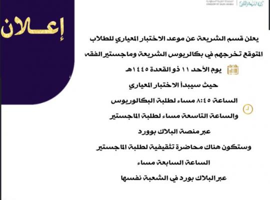 يعلن قسم الشريعة عن موعد الاختبار المعياري للطلاب المتوقع تخرجهم في بكالريوس الشريعة وماجستير الفقه يوم الأحد ١١ ذو القعدة ١٤٤٥هـ ..