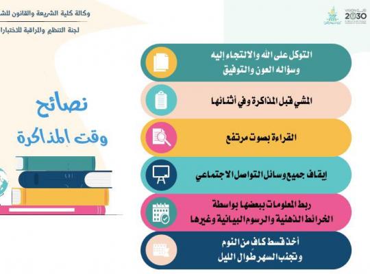 ترحب كلية الشريعة والقانون بطلابها وطالباتها في الاختبارات النهائية للفصل الدراسي الثالث (20243) ابتداء من تاريخ 18/11/1445 نصائح وقت المذاكره