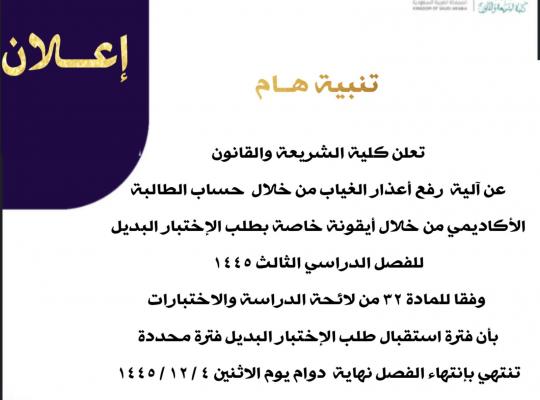 تعلن كلية الشريعة والقانون عن آلية رفع أعذار الغياب من خلال حساب الطالبة الأكاديمي من خلال أيقونة خاصة بطلب الإختبار البديل للفصل الدراسي الثالث ١٤٤٥ وفقا للمادة ٣٢ من لائحة الدراسة والاختبارات بأن فترة استقبال طلب الإختبار البديل فترة محددة تنتهي