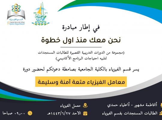دعوة لحضور دورة تدريبية بعنوان "نحن معك منذ أول خطوة" بقسم الفيزياء بالكلية الجامعية بصامطة