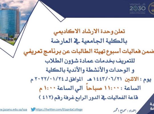 تعلن وحدة الإرشاد الأكاديمي(عن برنامج التعريفي بخدمات عمادة شؤون الطلاب )