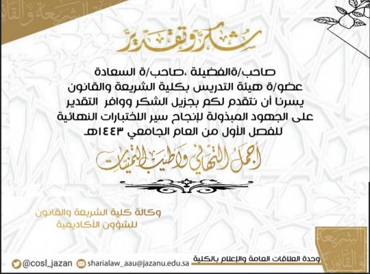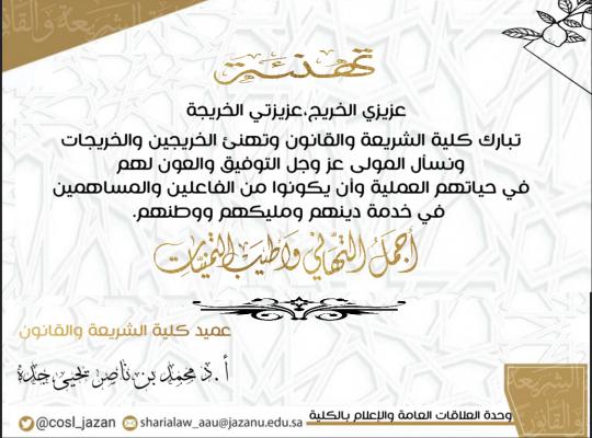 تبارك كلية الشريعة والقانون وتهنئ جميع الطلاب والطالبات