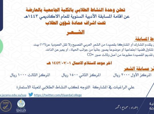تعلن وحدة النشاط الطلابي عن اقامة المسابقة الأدبية السنوية بعنوان ( الشعر )