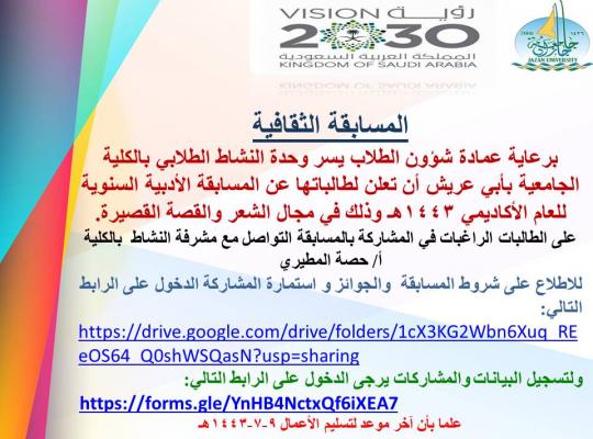 برعاية عمادة شؤون الطلاب يسر وحدة شؤون الطالبات يسر وحدة النشاط الطلابي بالكلية الجامعية بأبي عريش أن تعلن لطالباتها عن المسابقة الأدبية السنوية للعام الأكاديمي 1443هـ وذلك في مجال الشعر والقصة القصيرة، فعلى الطالبات الراغبات في المشاركة في المسابقة