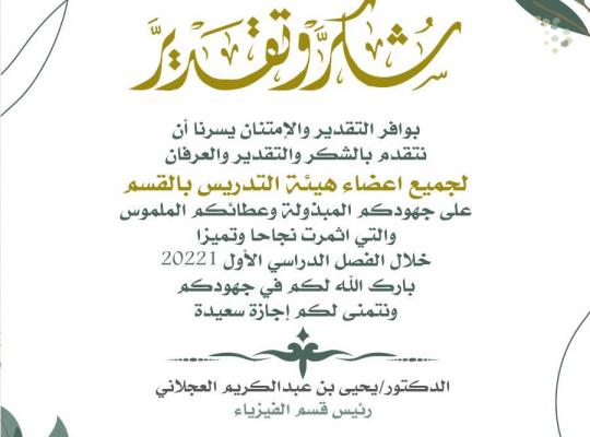 شكر وتقدير من د. يحيي العجلاني رئيس القسم و د. عيش مدخلي مساعد رئيس القسم لجميع اعضاء هيئة التدريس بالقسم و لكافة منسوبي ومنسوبات كلية العلوم وعلى رأسهم عميد الكلية الدكتور ابراهيم رديني لجهودهم المبذولة و عطائهم الملموس خلال الفصل الدراسي الأول