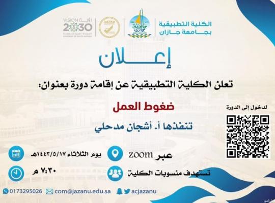 تعلن #الكلية_التطبيقية عن إقامة دورة بعنوان ضغوط العمل تنفذها أ.اشجان مدحلي يوم الثلاثاء الموافق ١٧/ ٥/ ١٤٤٣ عبر برنامج ZOOM رابط الحضور https://zoom.us/j/99663687604?pwd=YU0ycHM5TGNtbGZpcWpnQ2NBN0tHQT09… #جامعة_جازان