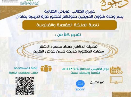 لتهيئة الخريجين والخريجات لسوق العمل، نظمت وحدة شؤون الخريجين بكلية الشريعة والقانون، في إطار خطتها للعام الجامعي 1443هـ، دورة تدريبية بعنوان: "تنمية الملكة الفقهية والقانونية"، اشترك في تقديمها: فضيلة د. جهاد محمود الأشقر عضو هيئة التدريس بقسم