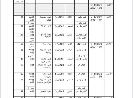 جدول اختبارات المقررات العملية للفصل الدراسي الأول (20221) للعام الجامعي 1443 هـ