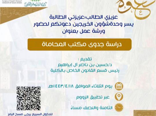 ضمن ورش العمل التي تنفذها وحدة شؤون الخريجين في كلية الشريعة والقانون؛ للطلاب والطالبات المتوقع تخرجهم في العام الجامعي ١٤٤٣ه، تنظم الوحدة ورشة عمل بعنوان "دراسة جدوى مكتب محاماة"، يقدمها سعادة الدكتور حسين بن ناصر آل إبراهيم، رئيس قسم القانون الخاص