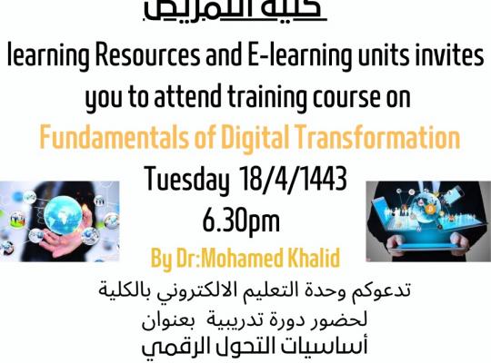 تدعوكم وحدة التعليم الالكتروني بالكلية لحضور دورة تدريبية بعنوان ( أساسيات التحول الرقمي) وذلك بتاريخ 18/11/2021 في تمام الساعة 6:30 pm