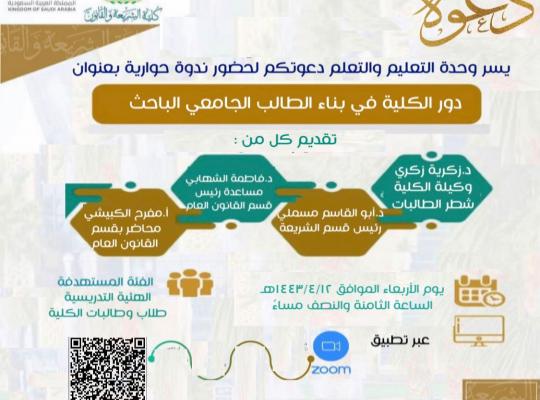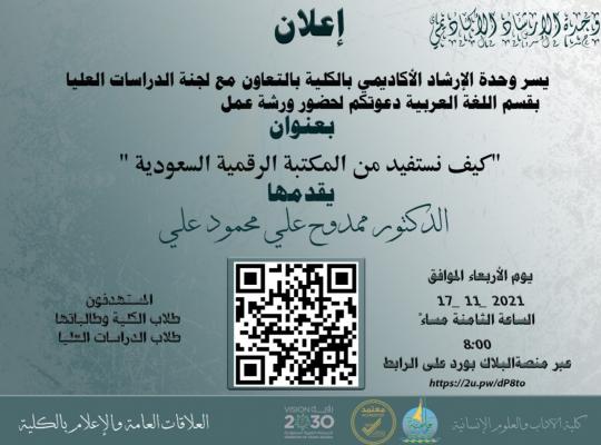يسر وحدة الإرشاد الأكاديمي بالكلية بالتعاون مع لجنة الدراسات العليا بقسم اللغة العربية دعوتكم لحضور ورشة علمية يقدمها الدكتور/ ممدوح علي محمود، بعنوان : (كيف نستفيد من المكتبة الرقمية السعودية) الساعة الثامنة من مساء الأربعاء ٢٠٢١/١١/١٧م عبر منصة