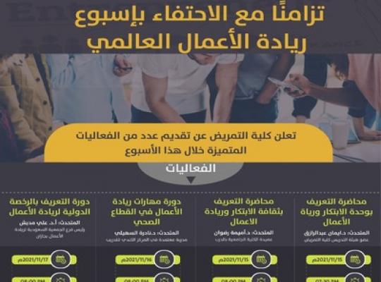 تعلن كلية التمريض عن تقديم عدد من الفعاليات المتميزة خلال هذا الاسبوع وذلك ابتداء من تاريخ 15 /11/ 2021 حتى 17/ 11 / 2021 م تزامنا مع الاحتفاء بإسبوع ريادة الأعمال العالمي
